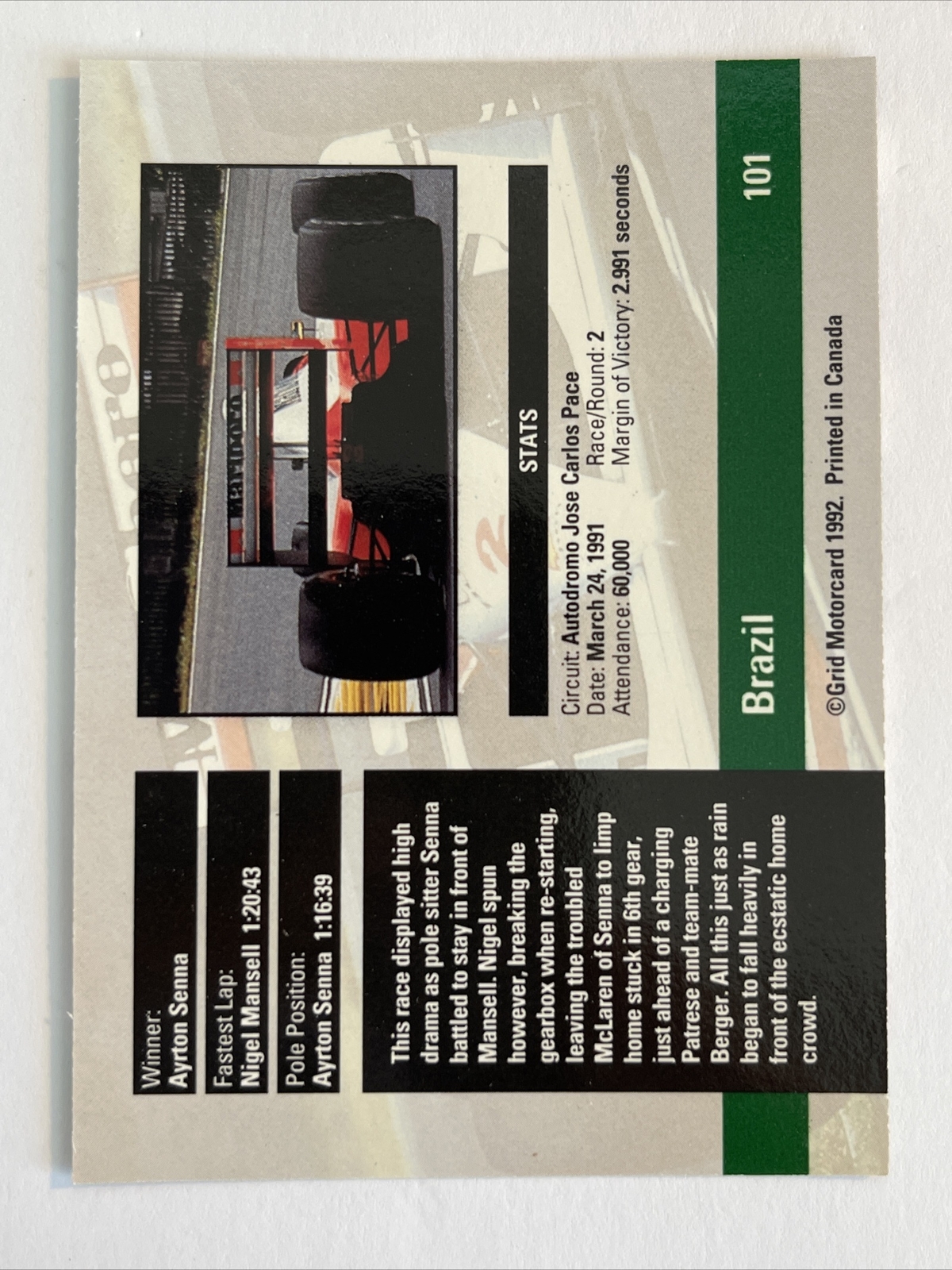 1992 Grid Motorcards Ayrton Senna #101