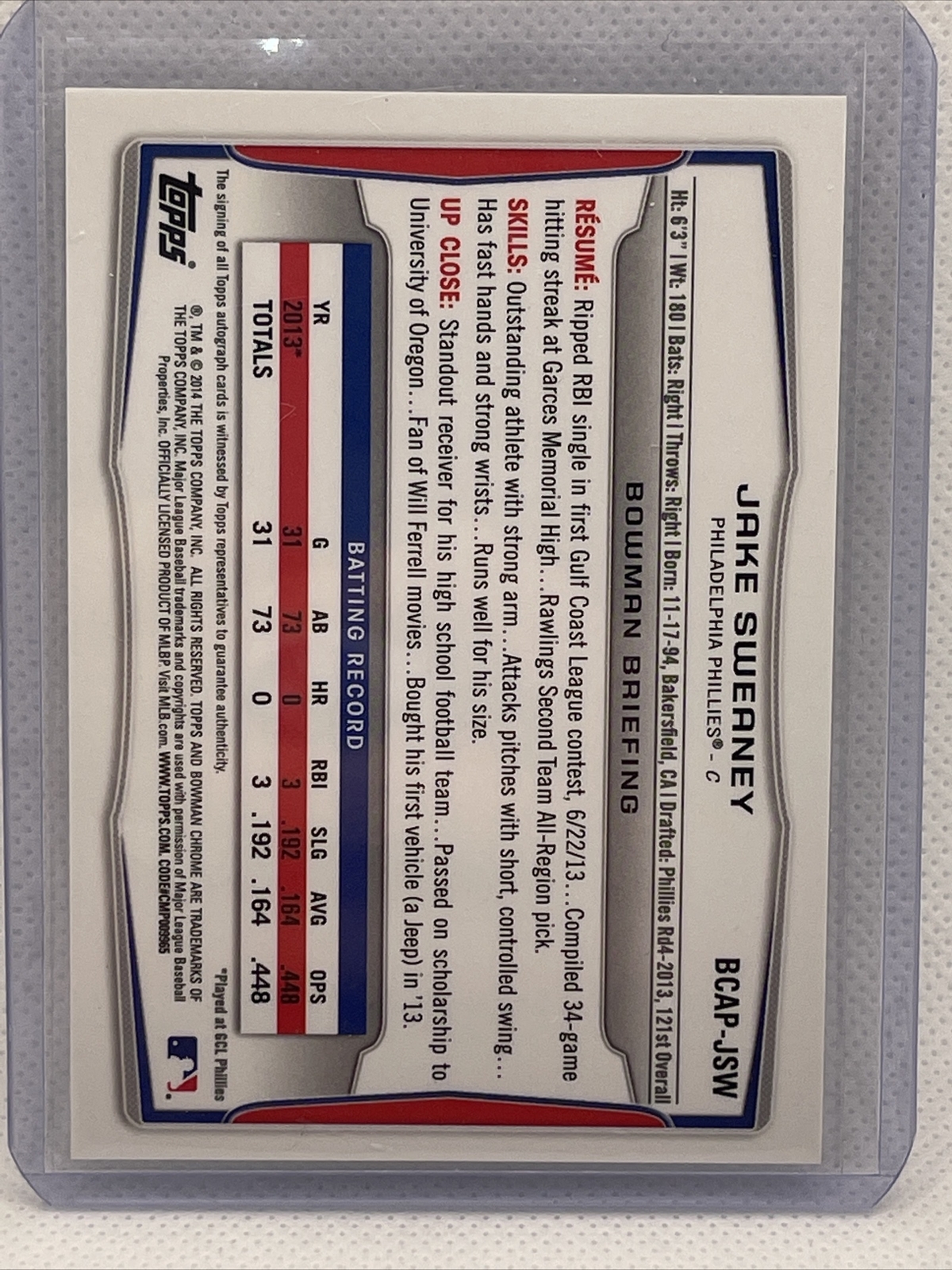 2014 Bowman Chrome JAKE SWEANEY Rookie RC AUTO AUTOGRAPH Philadelphia Phillies