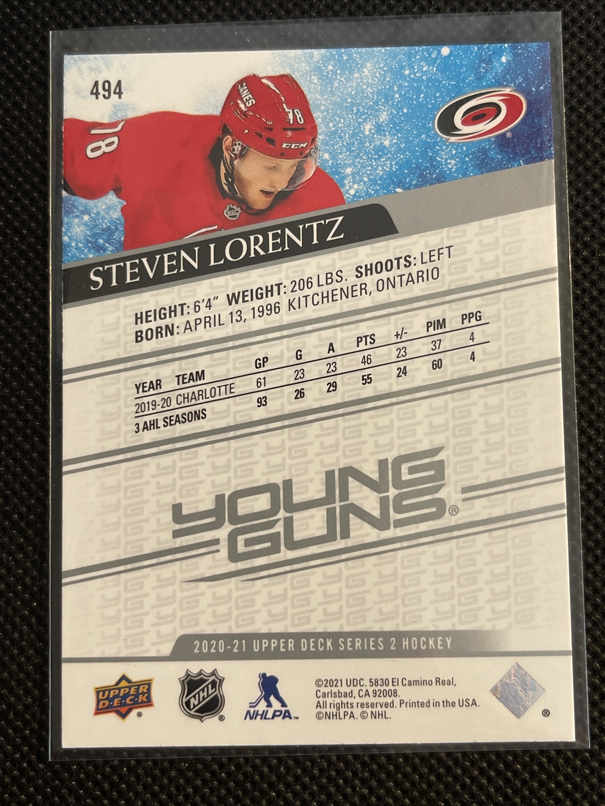 2020-21 UD SERIES 2 YOUNG GUNS STEVEN LORENTZ #494 HURRICANES ROOKIE PD