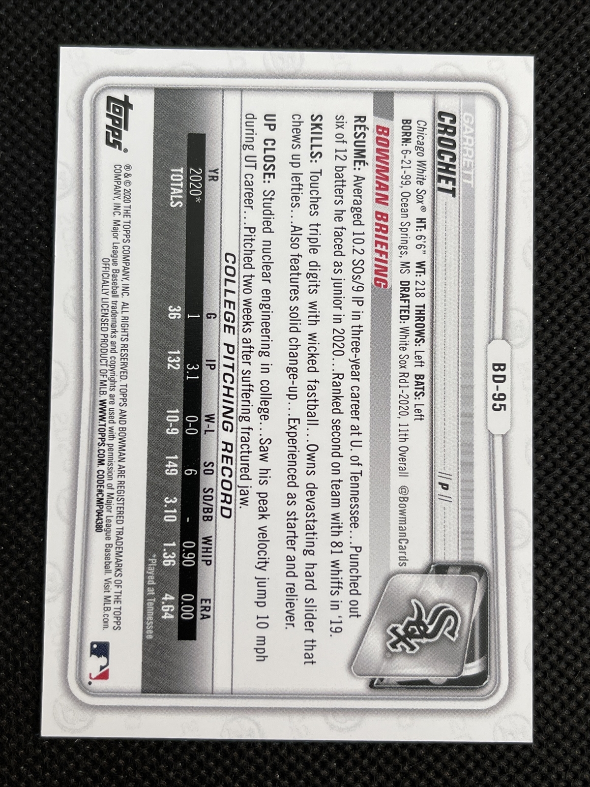 2020 Bowman Draft 1st Edition Garrett Crochet #BD-95 White Sox