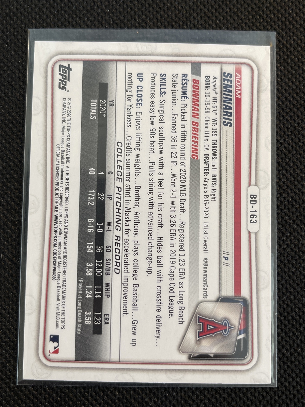 2020 Bowman Draft 1st Edition ROOKIE SKY BLUE #BD-163 ADAM SEMINARIS ANGELS
