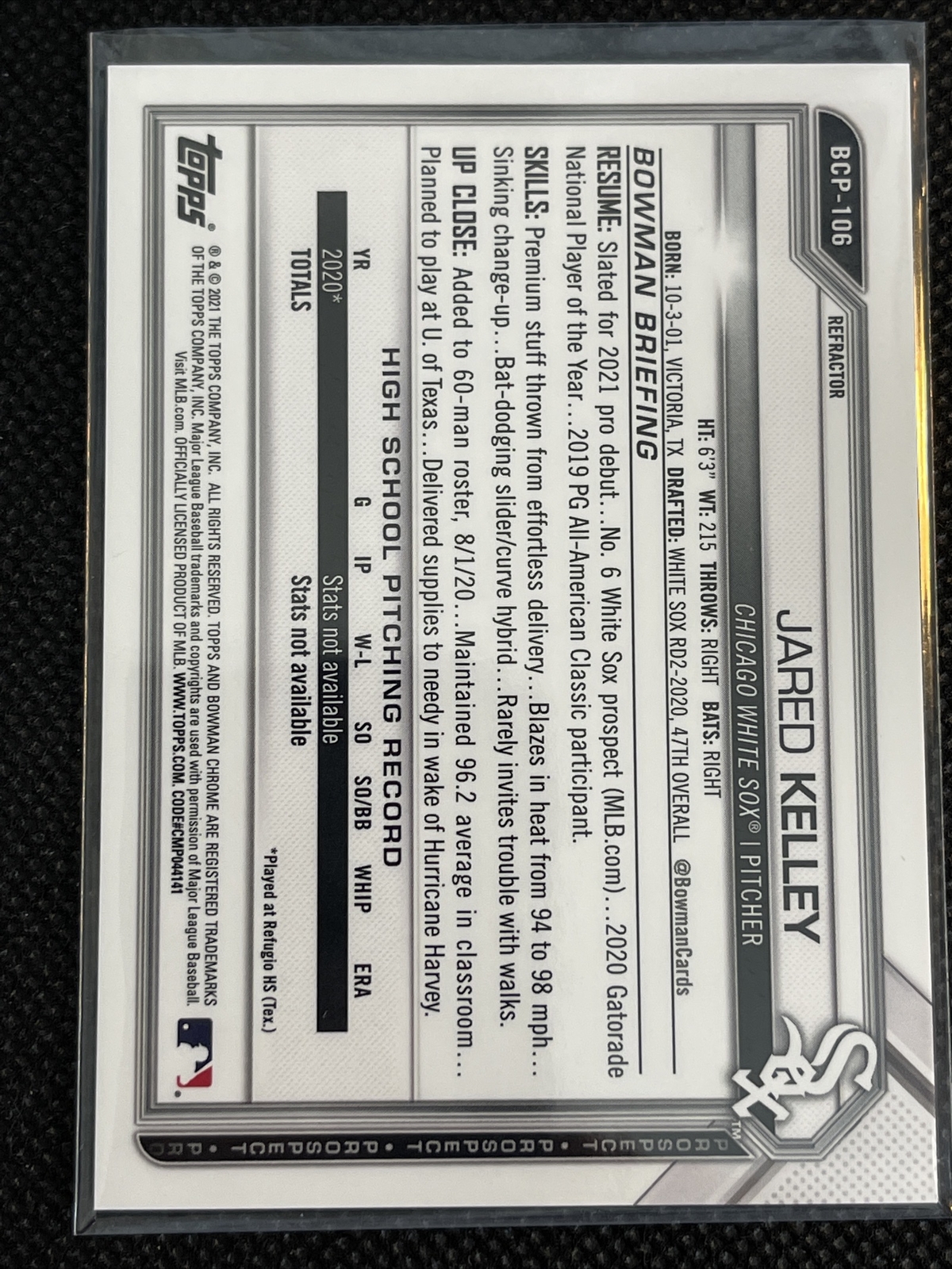2021 Bowman Chrome Jared Kelly 1st Bowman Refractor #/499 White Sox