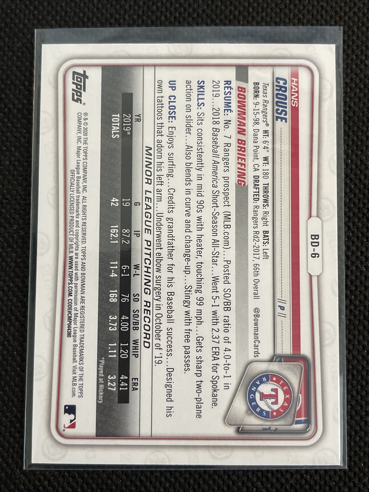 Hans Crouse 2020 Bowman Draft 1st Edition SKY BLUE PARALLEL Rookie #BD-6 RANGERS