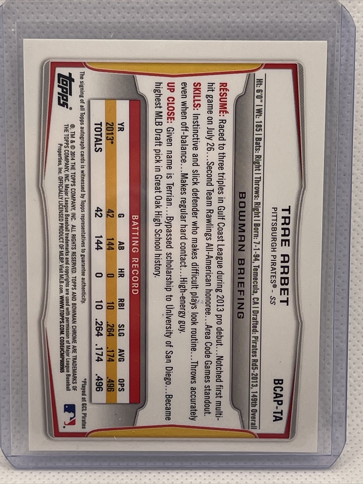 TRAE ARBET 2014 Bowman Chrome Prospects Auto Autograph Pittsburg Pirates BCAP-TA